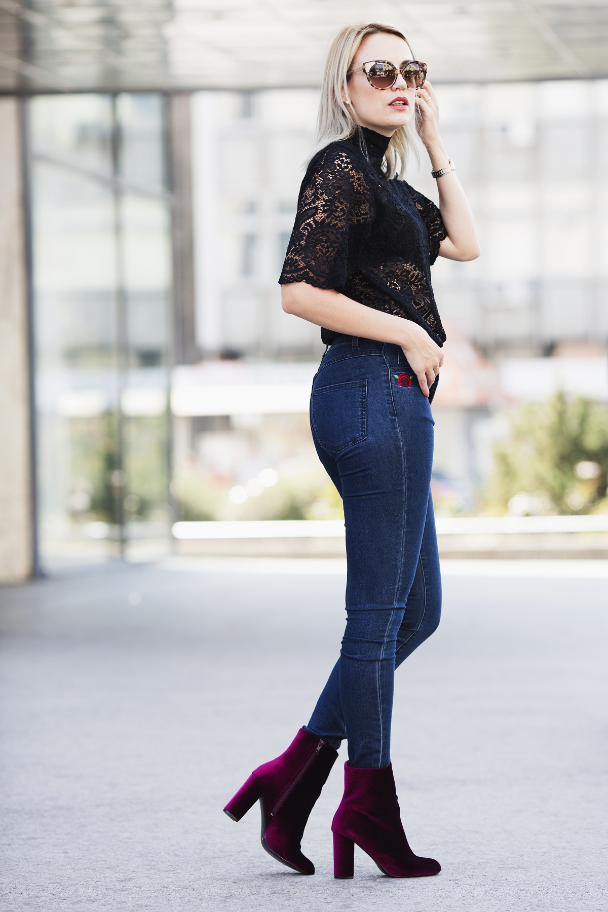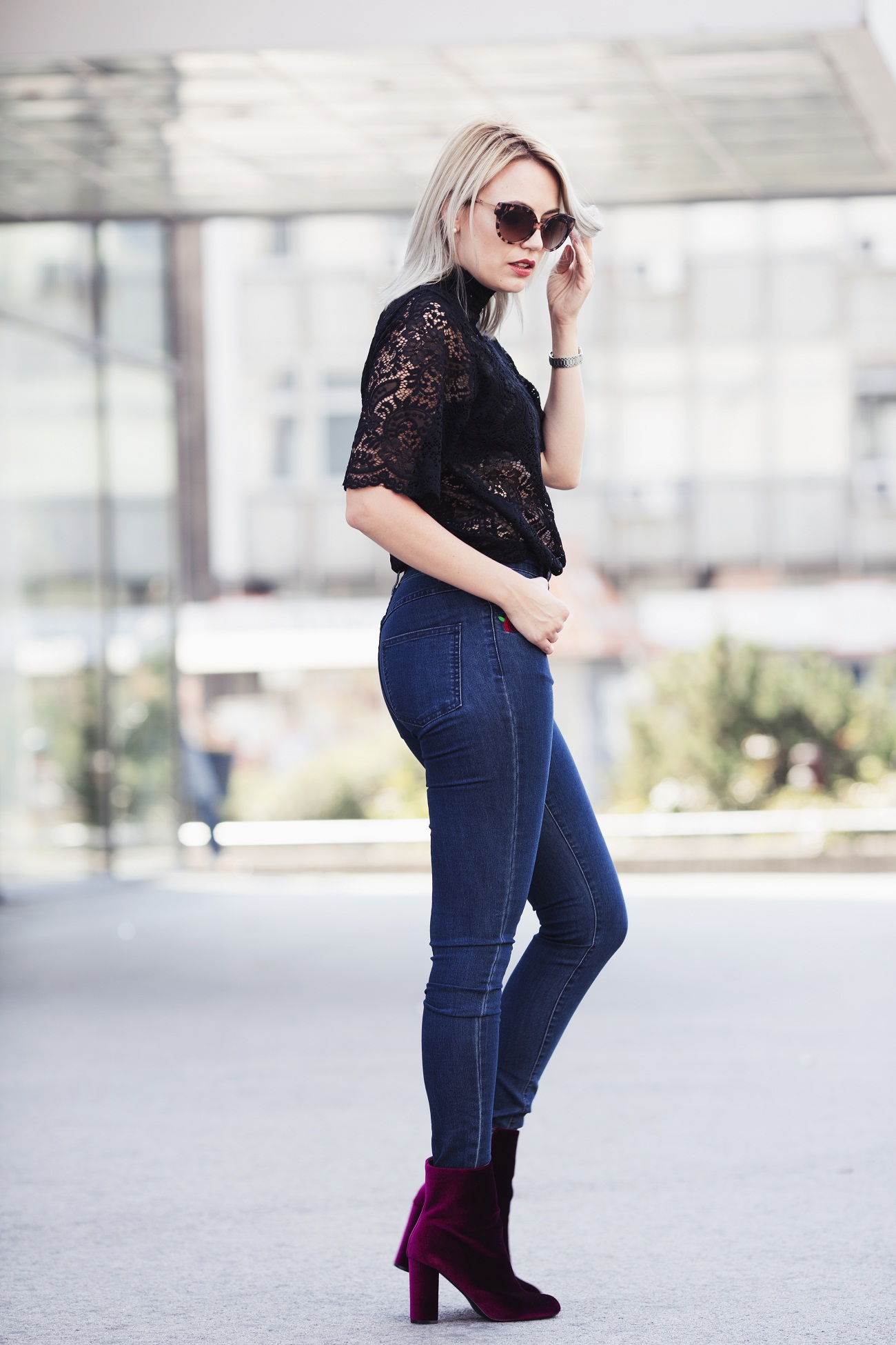 Hi everyone, today’s post will be short and quick :)reason why is that I am preparing for London Fashion week. It will be very hectic next few days for me, but I will keep you posted with latest fashion news from the catwalk. In todays post you can see me wearing casual but yet chic outfit. Embroidered jeans are latest trend you can see in the shops and I have decided to pair them with a black lace blouse and velvet boots. Final touch are those gorgeous and modern Michael Kors sunglasses. How do you like it?